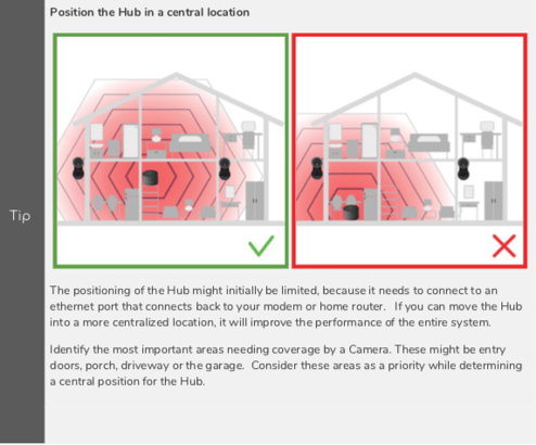Strategic placement of the Hub is an important step to ensure the system is optimized well across all deployed Cameras. There is not a one-size-fits-all solution for Hub positioning because each home is different.